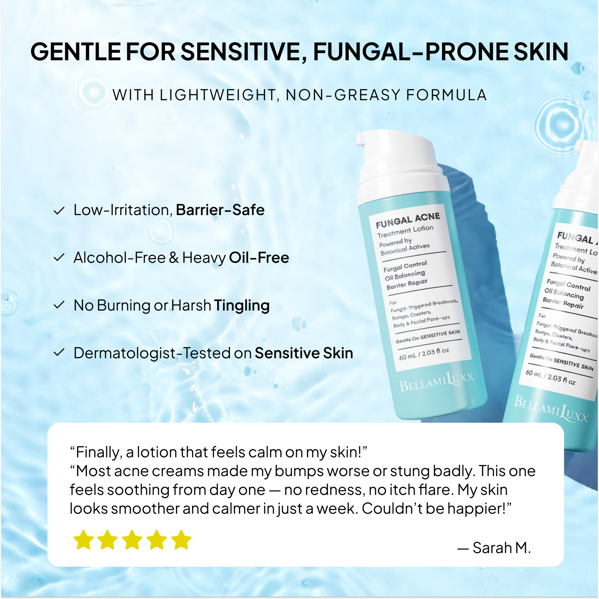 - Made for Fungal-Prone Skin – This fungal acne treatment lotion is specifically designed for bumps, clusters, redness, and itch linked to Malassezia yeast. Works as an effective acne treatment for face and body, supporting clearer, balanced skin.